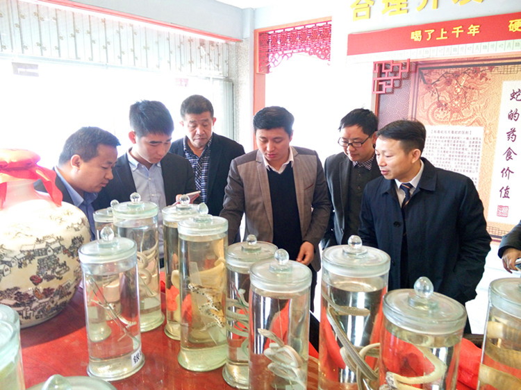 公司總經(jīng)理郭德志向湖南發(fā)展研究中心領(lǐng)導(dǎo)介紹蛇酒釀泡方法