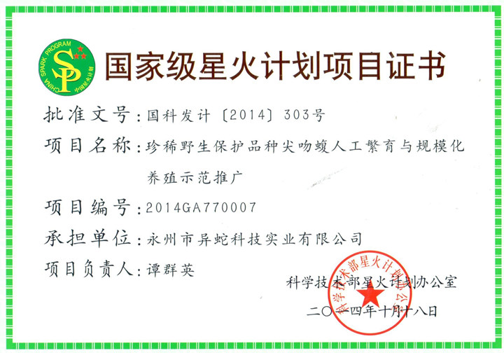 永州市異蛇科技實(shí)業(yè)有限公司《珍稀野生保護(hù)動(dòng)物品種尖吻蝮人工繁育與規(guī);B(yǎng)殖示范推廣》項(xiàng)目被列入國家級(jí)星火計(jì)劃,該技術(shù)與2015年獲得了湖南省科技進(jìn)步二等獎(jiǎng),填補(bǔ)了國內(nèi)尖吻蝮蛇人工繁養(yǎng)技術(shù)空白。
