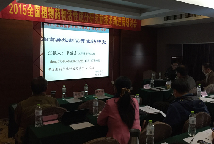 11月18日-20日,2015年全國植物藥物活性成分研究新技術(shù)新進(jìn)展研討會在湖南省長沙市翔云山水酒店舉行,旨在為進(jìn)一步推動植物藥物活性成分研究成果轉(zhuǎn)化與技術(shù)服務(wù)平臺建設(shè),加快產(chǎn)業(yè)技術(shù)創(chuàng)新,提高自主創(chuàng)新能力和科技含量,從而帶動醫(yī)藥及可食植物領(lǐng)域快速發(fā)展,搭建產(chǎn)學(xué)研交流互動的平臺。會議將采用主題演講和互動交流等方式與參會代表進(jìn)行深入、廣泛的研討和交流。公司旗下珍稀蛇類繁育與資源綜合利用湖南省工程實驗室研究員、湖南科技學(xué)院博士覃佐東先生作為代表,在會上發(fā)表了湘南異蛇制品開發(fā)的研究課題演講。
