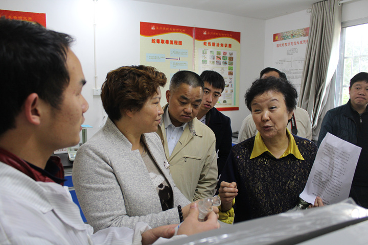 董事長譚群英向秦小明一行介紹公司在蛇毒領域的科研成果